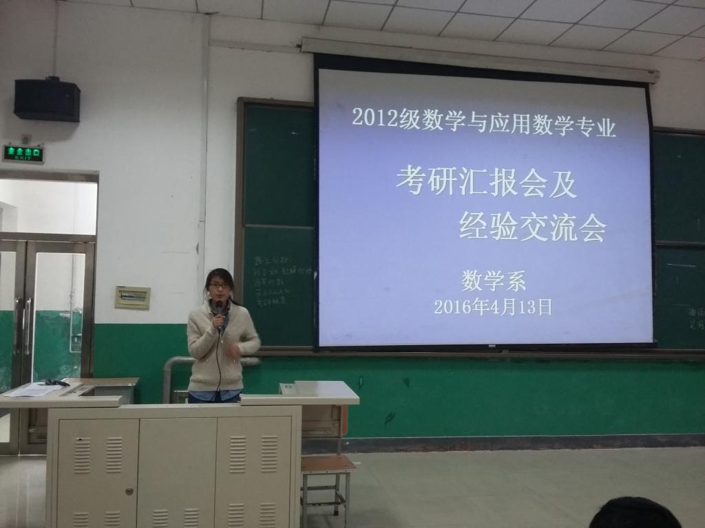 2016年4月13日下午3:30-5:00,数学系在第六教学楼阶梯教室组织召开了数学与应用数学专业学生成长成才经验交流会。2012级孙丽娟等考研成功的同学,2013级、2014级和2015级同学代表、教师代表共计159人参加了会议。会议由系主任张玲老师主持。会上,张老师对2016年考研工作进行了全面总结。孙丽娟、王文丽、王旭和杨帆同学就学习方法、时间分配、面试技巧和调剂等方面交流了经验,并和与会同学分享了考试心态、临场发挥等成功做法。学院党总支书记刘国清参加了会议并讲话,刘书记对考研成功同学表示热烈祝贺,对即将准备考研的同学们提出要求和期望。在此次经验交流会上,考研成功的同学还现场耐心地回答了低年级同学的咨询和提问,为同学们答疑解惑,使同学们知晓更多的考研方法和技巧。通过此次交流会,对指导低年级立志考研的同学进一步明确奋斗目标,掌握学习、备考的方法,实现人生目标起到了积极的促进作用。
