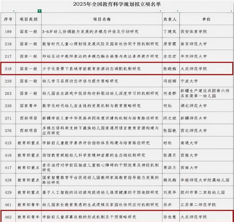 在此次公示的540项拟立项项目中,学前教育类别课题共16项。我院张晓梅教授主持申报的《少子化背景下县域学前教育资源动态调配机制研究》成功获批国家一般项目,孙佳慧老师主持申报的《学龄前儿童屏幕依赖的形成机制及干预策略研究》成功获批教育部青年项目。两项课题的成功突围,既体现了我院教师深厚的学术积累与创新研究能力,也彰显了我院在学前教育领域的研究优势与学科影响力。